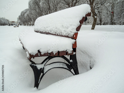 Snow covered bench in a park.
