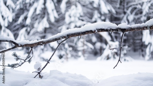 Snow Covered Branch in Winter Forest with Soft Snowy Background