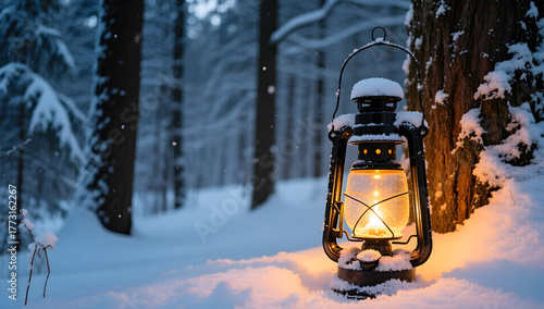 Snow covered lantern glowing warmly in a winter forest