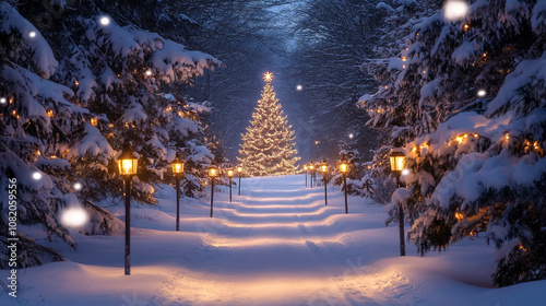 Snow Covered Pathway with Lanterns and Christmas Tree Glow in Forest