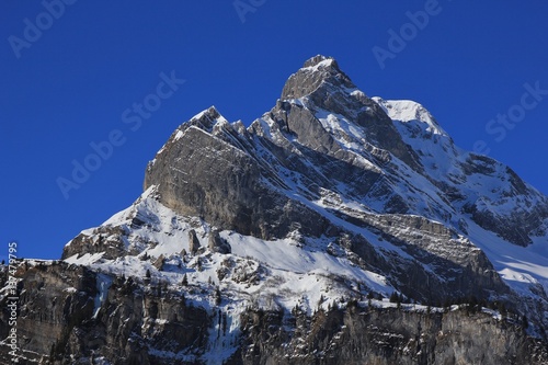 Snow covered peak of mount Ortstock, Swiss Alps.
