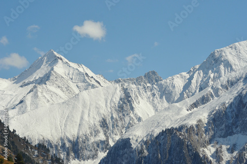 Snow covered peaks of the Ladakh mountain range rise into a blue sky with a few white clouds. A small patch of forest is to one side.