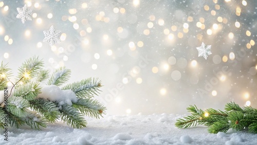 Snow Covered Pine Branches with Bokeh Lights and Snowflakes Winter Background