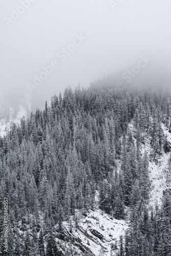 Snow covered trees on a mountain with fog in winter. Alberta, Canada
