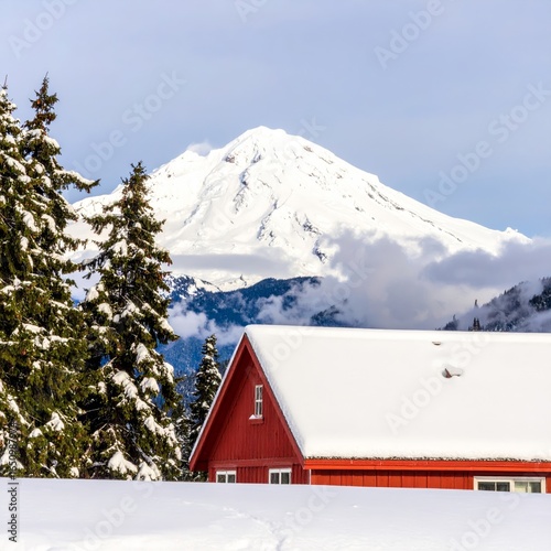 Snow Dusted Cabin Roof Against Cloudy Sky and Mountain Range