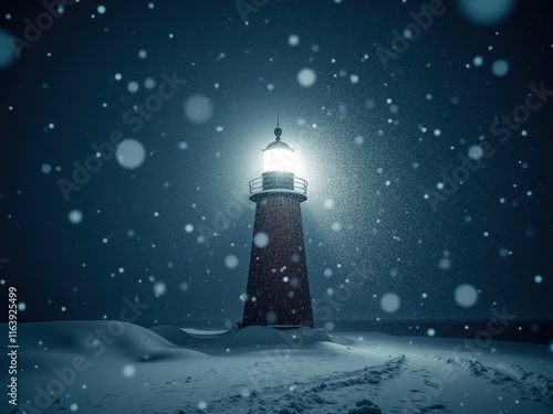 Snow falls heavily on a lighthouse guiding ships during a blizzard in a coastal area at night