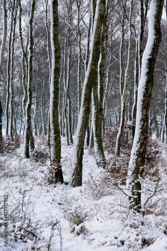Snow in birch forest in National Park de Hoge Veluwe in the Netherlands