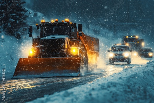 Snow plow grader clears highway during heavy snowfall while vehicles wait in line against a winter backdrop