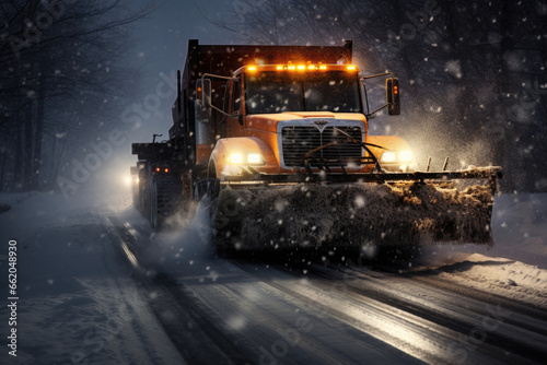 Snow plow truck clearing road after winter snowstorm or blizzard
