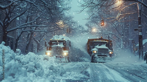 Snow plows clearing residential streets during a blizzard, illuminated by streetlights, with heavy snowfall and snow-covered trees lining the road.