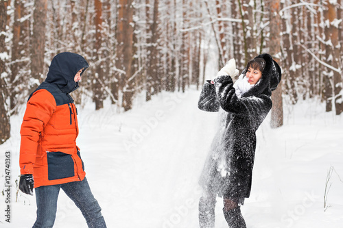 Snowball fight. Winter couple having fun playing in snow outdoors.