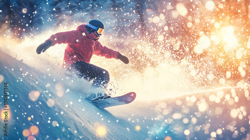 Snowboarder Carving Through a Frozen Wave, with Snow Exploding Into Stars and Bright Lights