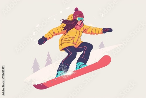 snowboarder jumping on the slope, flat illustration in colours yellow, pink and blue.