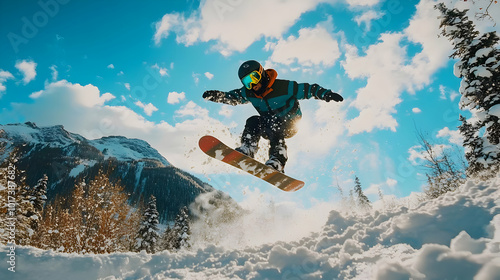 Snowboarder performing a jump in a winter landscape.