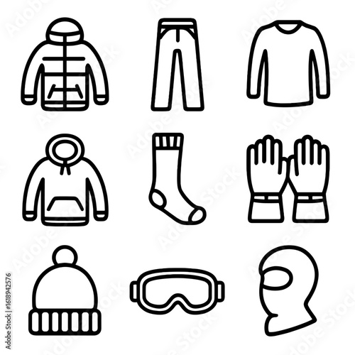 Snowboarding Gear Icons. Solid, filled icon set of snowboarding apparel: insulated jacket, snow pants, thermal base layer, fleece