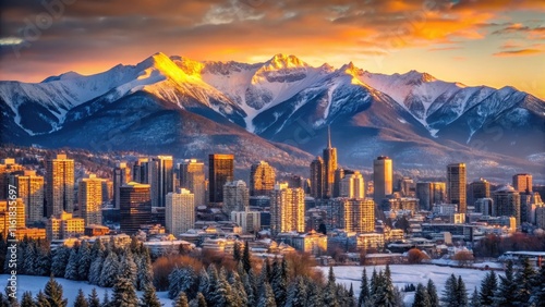 Snow-capped mountains and cityscape at sunset, vancouver, skyline
