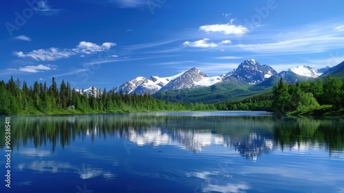 Snow-capped mountains reflecting in a tranquil lake under a clear blue sky, surrounded by lush forests