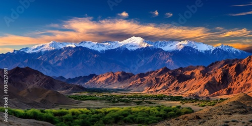 Snow-capped mountains rise above a valley with green trees and golden hills under a colorful sky