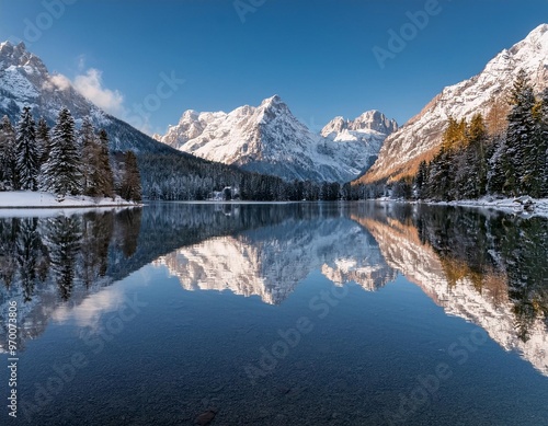 Snow-capped peaks reflected in a tranquil alpine lake during winter