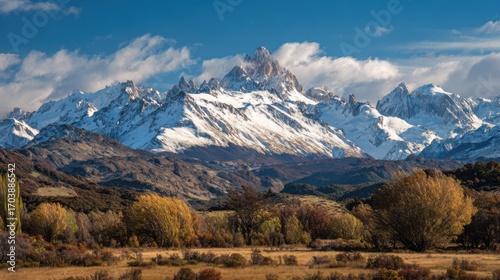 Snow-capped peaks rise dramatically over a colorful valley filled with autumn foliage.