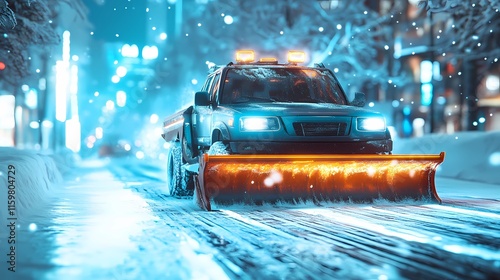 Snow-clearing truck working in a city, keeping streets accessible, illustrated in a clean and structured technical style