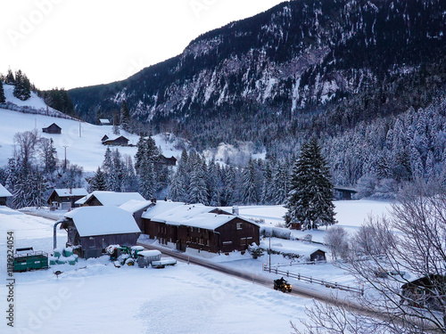 Snow-covered barn and farm house, Rougemont
