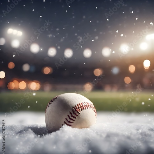 Snow-covered Baseball Ball with a Blurred Stadium Backdrop on Warm Night Ambiance