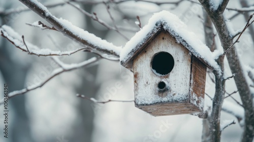Snow-Covered Birdhouse on Tree Branch with Thin Snow Layer on Roof