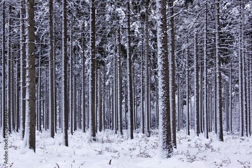Snow-covered coniferous forest in winter, common spruce (Picea abies), Tangstedter Forst forest, Schleswig-Holstein, Germany, Europe