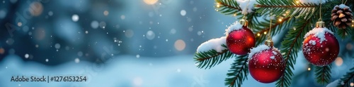 Snow-covered fir branch with sparkling baubles and pinecones, , wintery atmosphere
