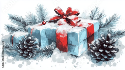 Snow-Covered Holiday Gift Boxes with Red Ribbons – Winter Festive Illustration