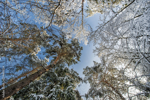Snow-covered landscape with trees and blue sky, Russian winter.