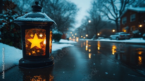 Snow-covered lantern glowing on a wet, snowy street at night.