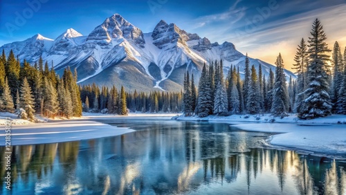Snow-covered mountain range with frozen lake and pine trees in frosty morning