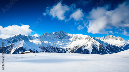Snow-covered mountains under a blue sky with white clouds, snow scene promotion
