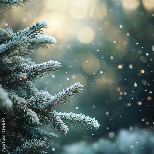 Snow-covered pine branches in a serene winter forest setting.
