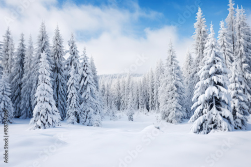 Snow-covered pine trees in bright sunlight