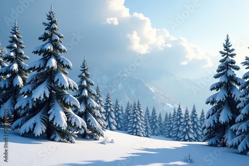 Snow-covered pine trees tower above in the frozen forest landscape, mistletoe, spruce, evergreen