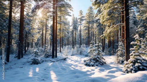 snow-covered pine trees, winter forest, sunlight filtering through branches, path in snowy landscape, cold weather atmosphere, peaceful winter scenery, picturesque winter wonderland, tranquil forest l