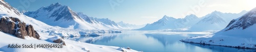 Snow-covered planet landscape with frosty mountains and a frozen lake, space winter, planetary snow