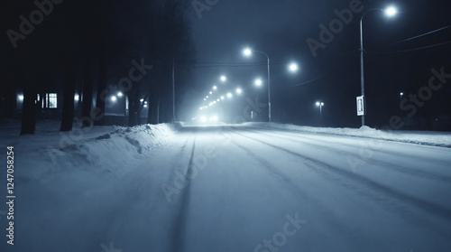 Snow-covered road at night with glowing streetlights. winter background, Blue Monday, cold weather