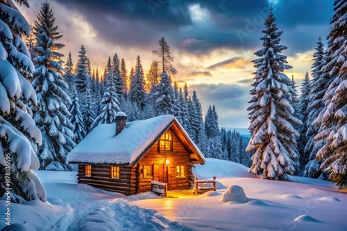 Snow-dusted pines frame a cozy cabin; winter's peaceful embrace in a snowy landscape.