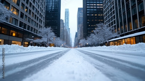 Snow-dusted skyscrapers and frozen streets with soft winter light reflecting off glass buildings in the city