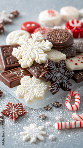 Snowflake chocolate dessert candy cane red white brown sweet treat festive winter sprinkle decoration holiday cocoa shape background sugar swirl seasonal snack cold surface advertising commercial