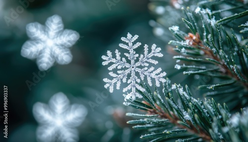 Snowflake closeup, winter nature photography, snow crystals, winter frost, pine needles and snowflakes, frozen beauty, macro snowflake photography.