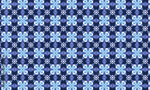 Snowflake winter geometric pattern. Winter holiday vector seamless ornament in blue colours for textile, fabric, interior, ceramic, wallpaper, paper decoration