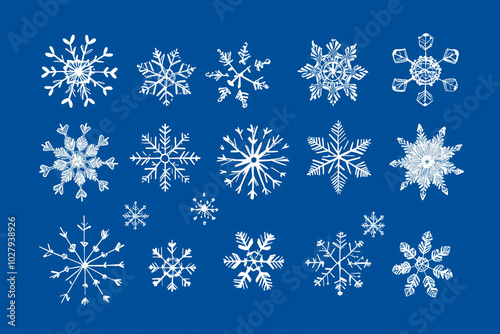 snowflakes, clean geometric shapes, bold white lines on a blue background, various sizes and patterns of snowflakes, flat colors