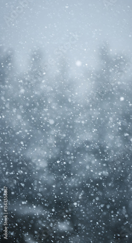 Snowflakes Falling Gently Against a Blurred Forest Backdrop, A Winter Wonderland of Soft Snow and Muted Blue Tones