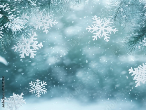 Snowflakes falling on pine branches with a soft blurred winter background