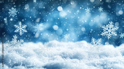 Snowflakes falling on snowy fairytale winter background.